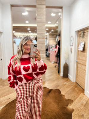 This "Heartfelt Harmony Sweater" features a cozy knit design with vibrant red and soft pink hues woven into a charming heart pattern right across the chest. The fabric looks warm and comfortable, perfect for chilly days, and the slightly relaxed fit gives it a laid-back yet stylish feel. The "Willow and Lace" tag adds a boutique touch, making it a standout piece that’s both sweet and trendy—ideal for spreading some love and good vibes wherever you go!