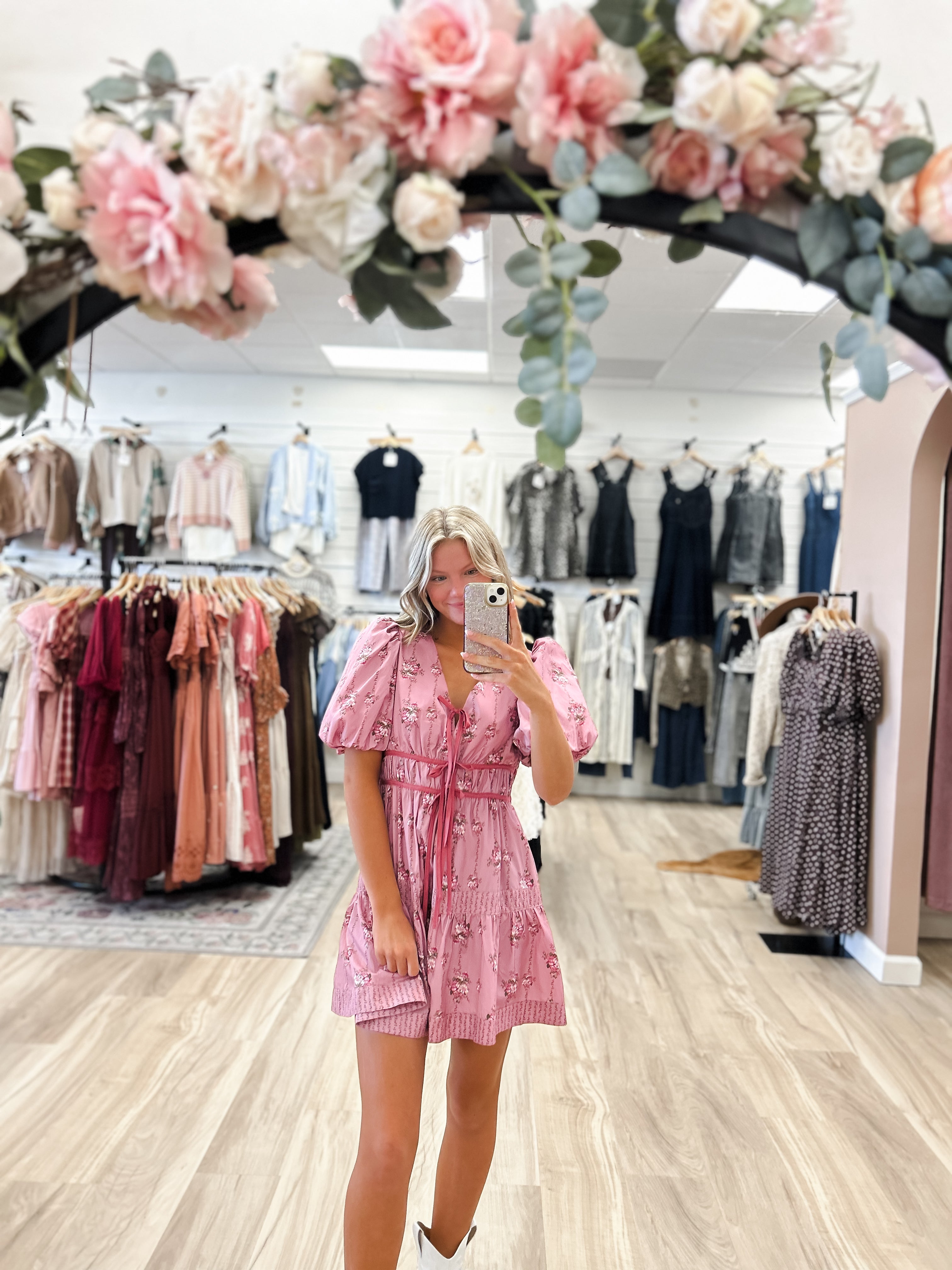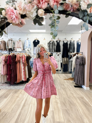 This pink floral dress is the perfect transition piece from summer to fall! The three bows on the front add the perfect balance of classy and casual!