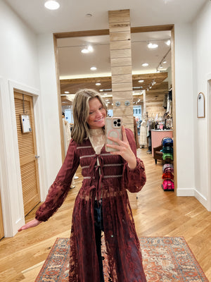 A striking blend of romance and allure, this wine-colored maxi dress is designed to captivate. Sheer from the waist down, it offers a graceful reveal of silhouette while maintaining elegance through its flowing, floor-length design. The long sleeves add a touch of sophistication, crafted from delicate lace that enhances the dress's feminine charm. Finished with dainty bow ties along the front and intricate lace detailing throughout, this piece is perfect for evening occasions, layered looks, or statement styling with a sultry edge.