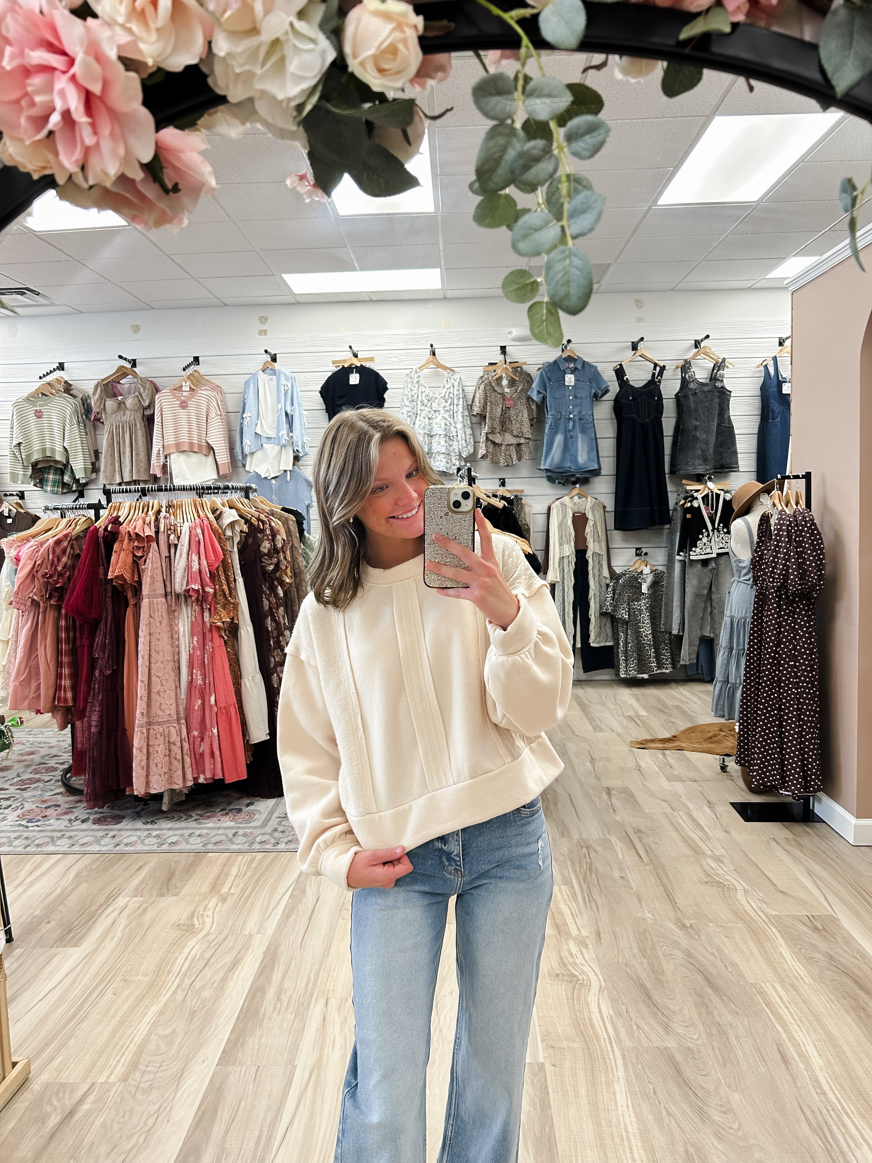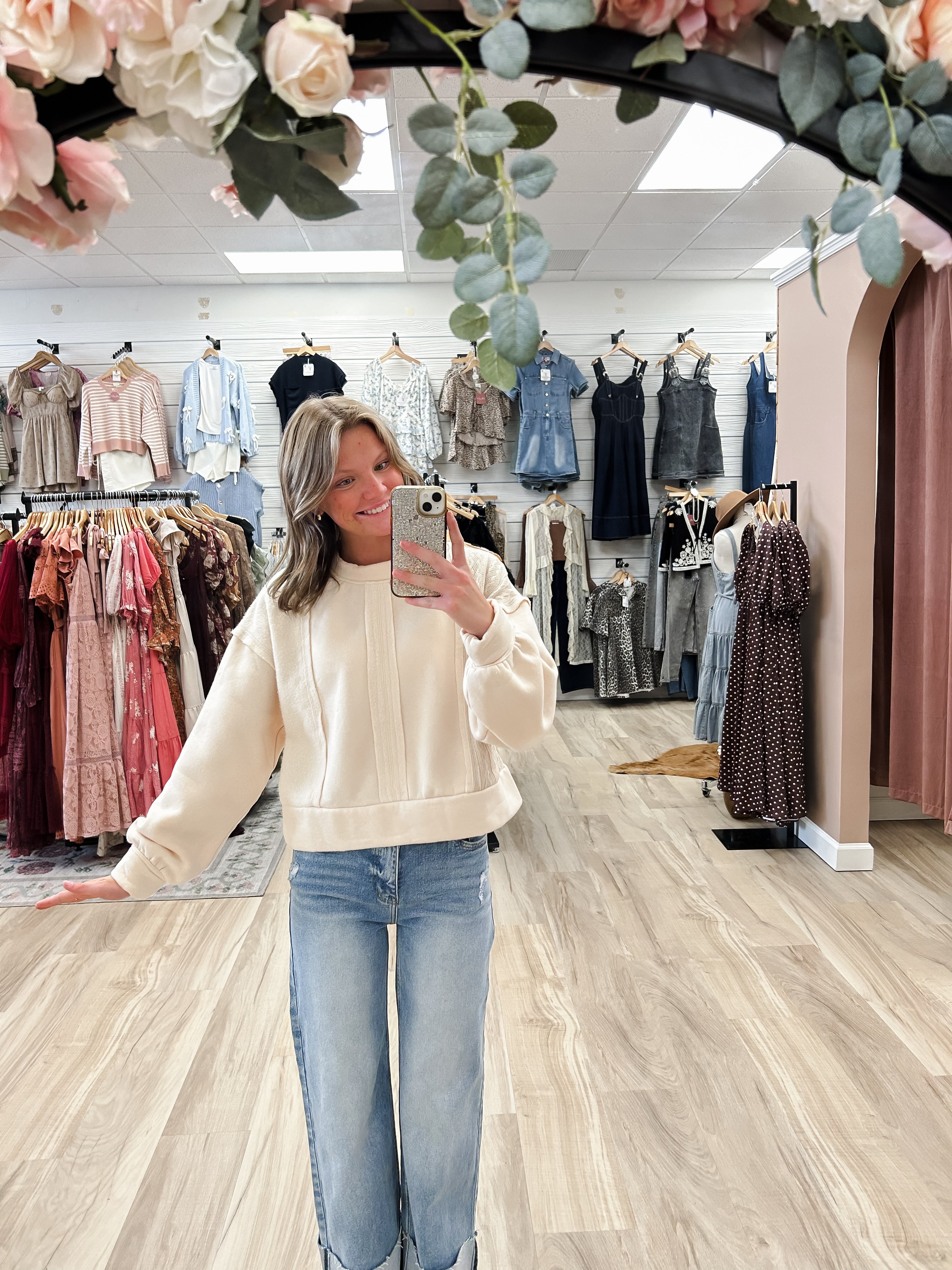 Soft, cozy, and effortlessly chic. This beige sweatshirt elevates casual style with delicate detailing on the front. With a relaxed fit and plush fabric, it ensures all day comfort.