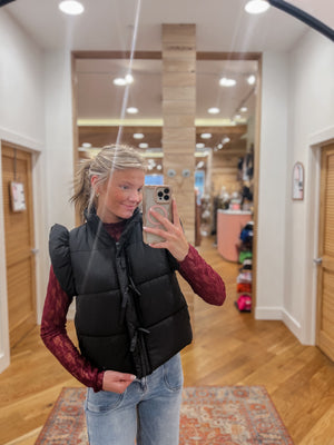 Elevate your winter wardrobe with the Livi Black Puffer Vest. Designed with a flattering mock neck and feminine flutter sleeves, this vest also features a zip-up front and bow detail. Keep warm and stylish with the solid, lined shell and cozy 100% polyester filling.