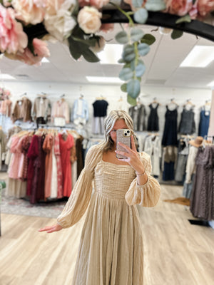 A sophisticated taupe maxi dress that blends understated elegance with modern comfort. Designed with long sleeves for a sleek, refined look, this dress features delicate cinching at the chest that creates subtle shape and definition without compromising on ease. The soft, flowing fabric drapes gracefully to the floor, offering both movement and modesty. Perfect for transitional seasons, evening gatherings, or minimalist wardrobes, this piece is a timeless staple with thoughtful detailing.