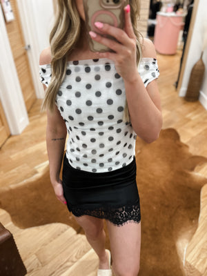 Elevate your date night look with our White Polka Dot Date Night top. Made from a comfortable blend of 85% polyester and 15% spandex, it offers just the right amount of stretch for all-night wear. The soft polyester lining ensures a smooth fit, letting you focus on enjoying your evening.