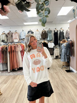Add some team spirit to your wardrobe with our Game Day Patchwork White Sweatshirt! Made from a comfortable blend of cotton and polyester, this white sweatshirt features a unique patchwork design in orange and white. Perfect for game day or any casual occasion!