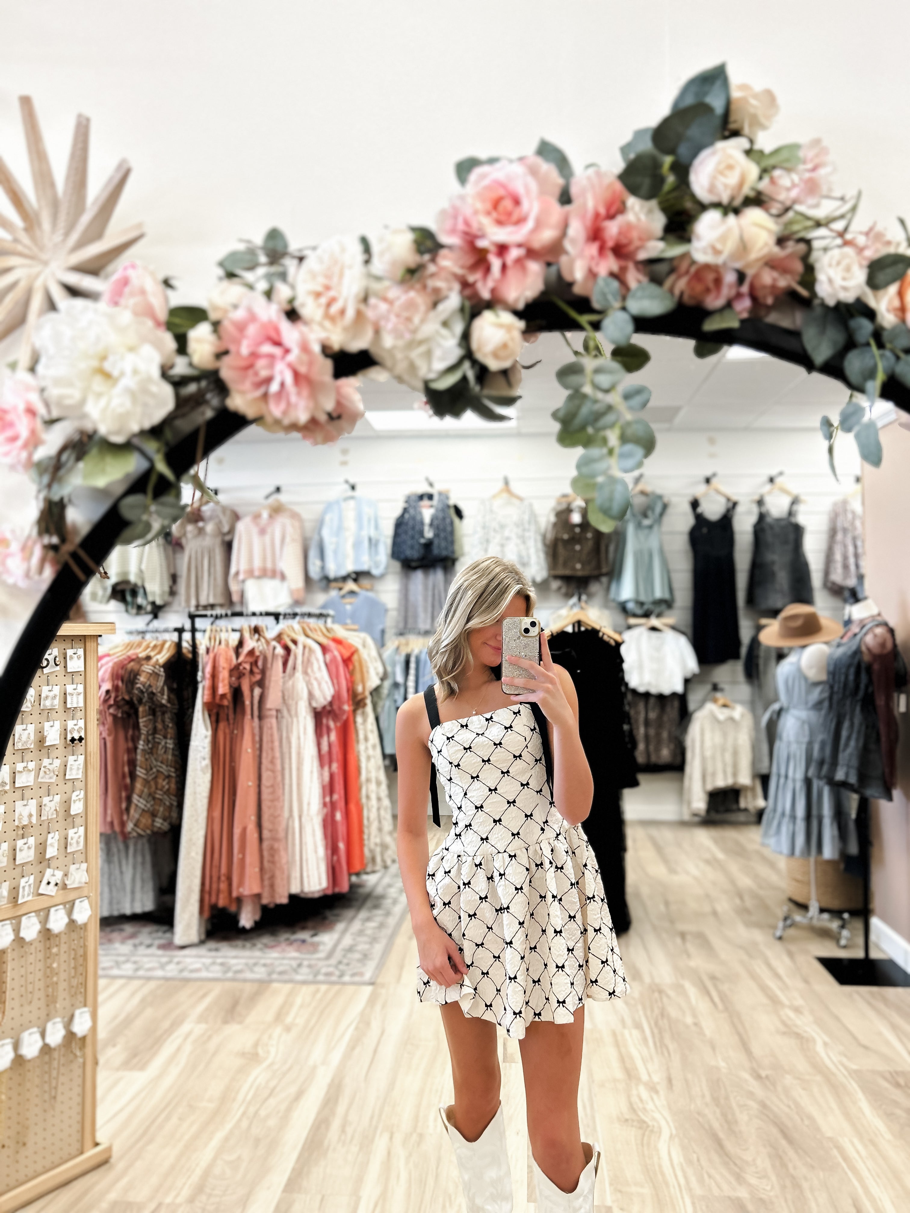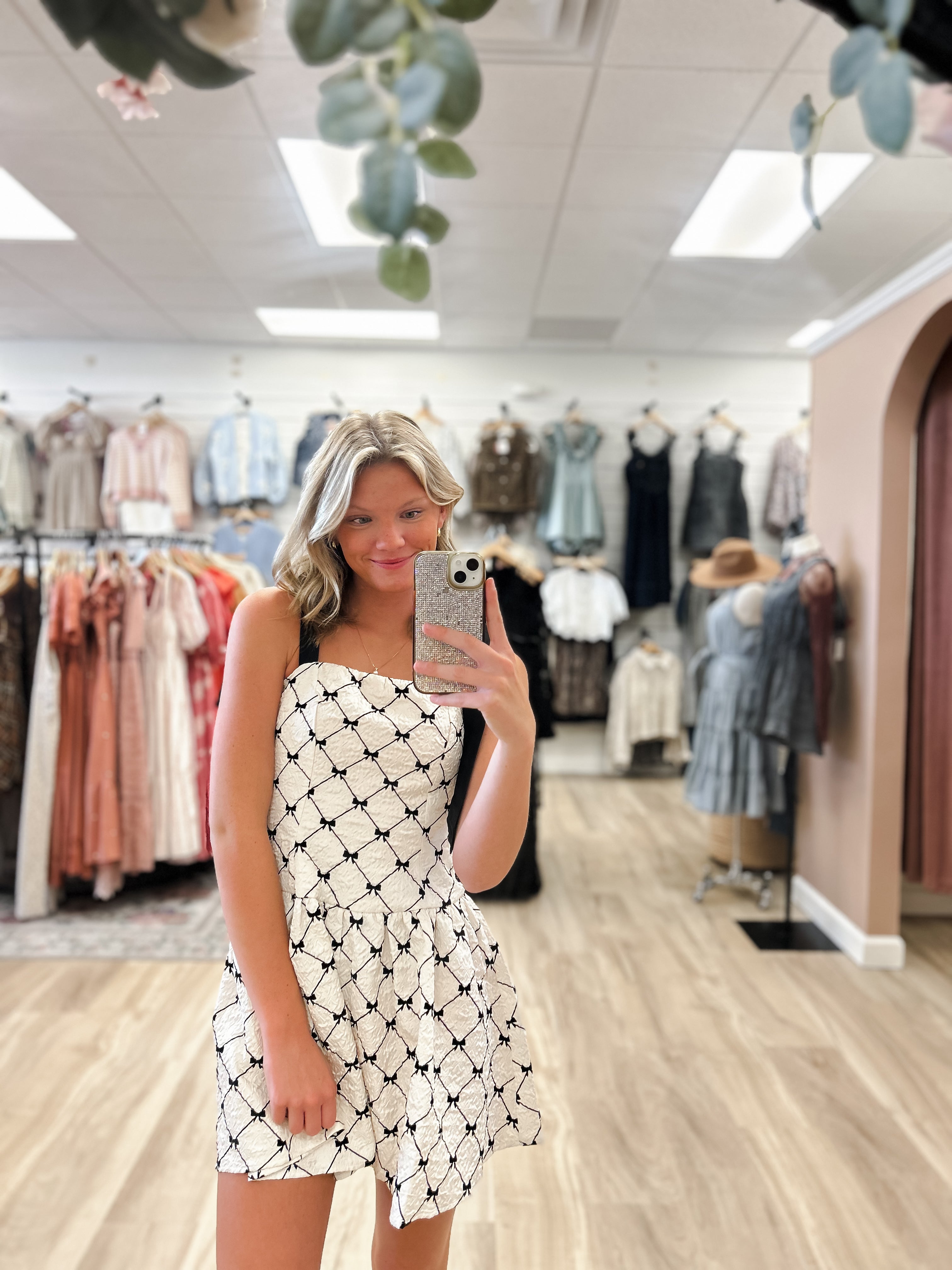 A timeless mix of sweet and chic, this cream mini dress is adorned with delicate black bows for the perfect feminine touch. Featuring a flattering silhouette and just the right amount of detail, it’s an effortless piece you can dress up with heels or keep casual with flats. A must-have for any bow lover’s wardrobe!