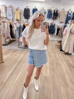 The Daisy Denim Skort combines style and comfort with its soft, 100% cotton fabric and playful polka dot print. The wrap design offers a flattering fit that moves with you, making it a versatile choice for casual outings or summer days. Enjoy effortless fashion with this delightful skort!