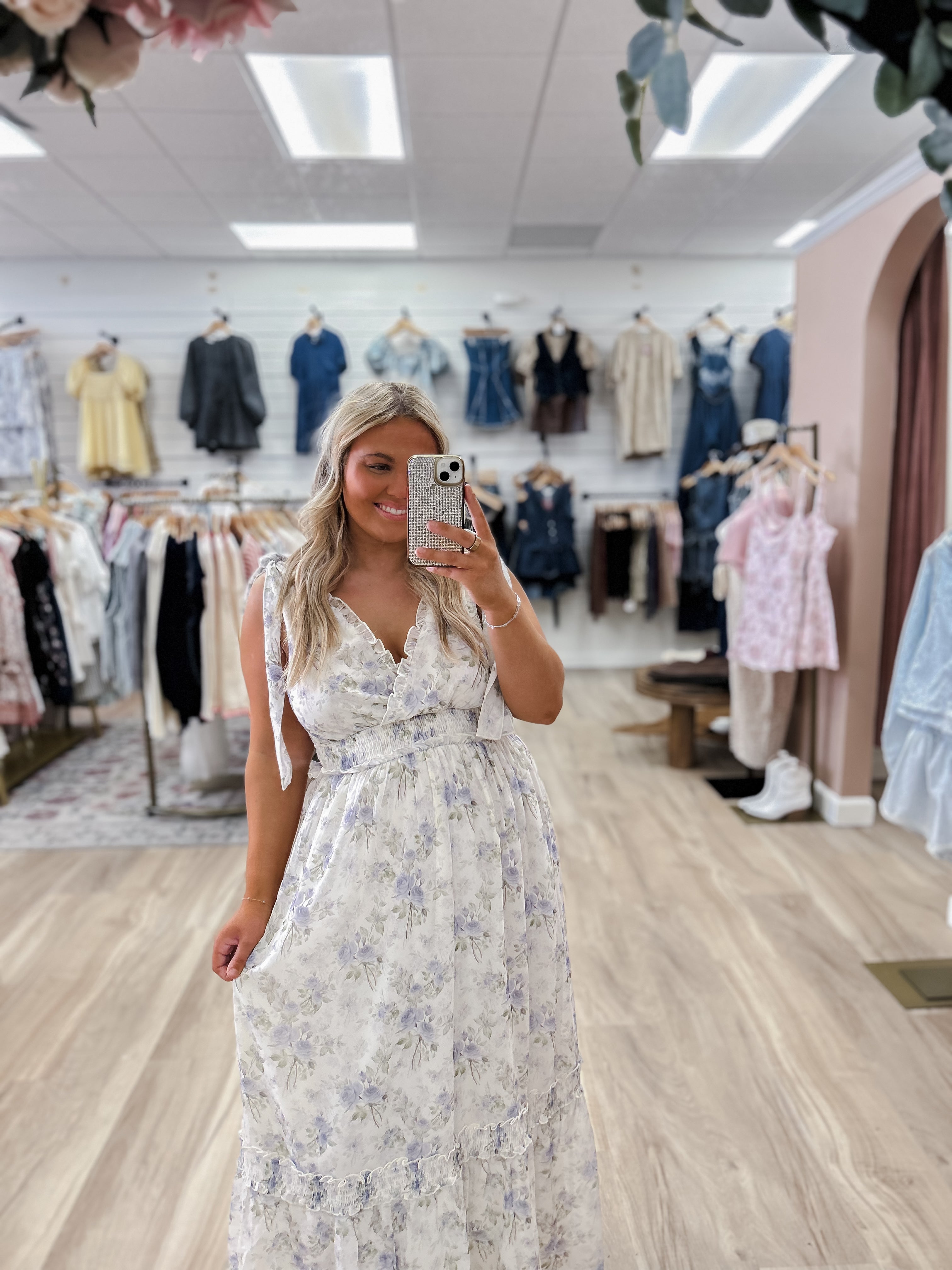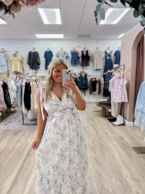Pure romance, bottled up in a dress. This breathtaking maxi dress is everything a dreamer could wish for — delicate lavender and sage roses scattered across a whisper-soft ivory chiffon, gathered with a smocked empire waist that cinches beautifully without trying. Dainty ruffle trim cascades along the straps, waist, and flowing hem, giving it that irresistible ethereal quality that makes heads turn and hearts flutter. Whether you’re wandering through a garden party, a summer wedding, or a golden hour photo shoot, this dress was made for your most magical moments.