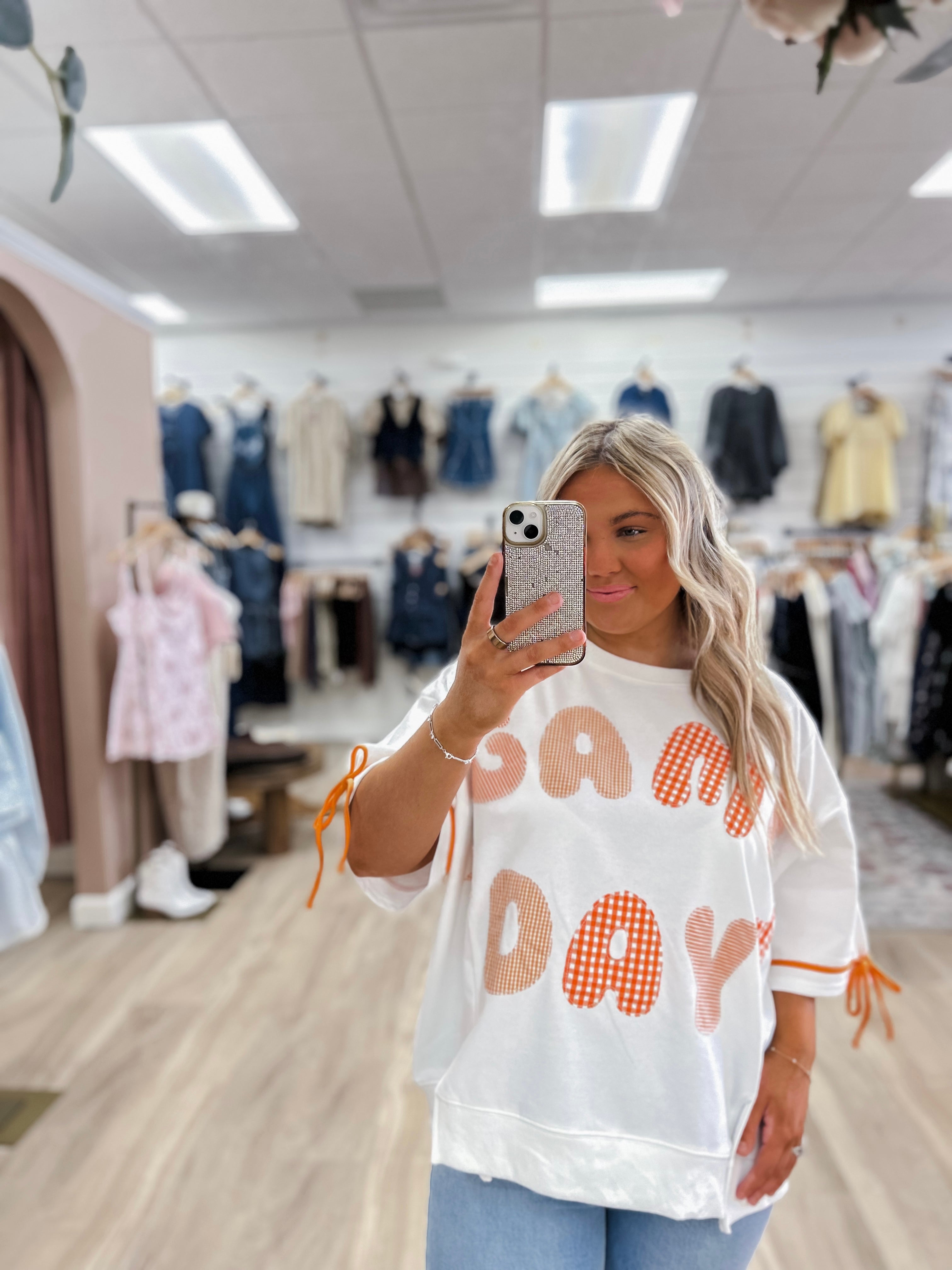 Bold, spirited, and made for the spotlight — the Orange Crush Game Day Pullover is your ultimate statement piece for cheering in style. This relaxed-fit white top features oversized “GAME DAY” lettering in playful orange gingham and stripe patterns, finished with coordinating star accents for that extra pop of team pride.