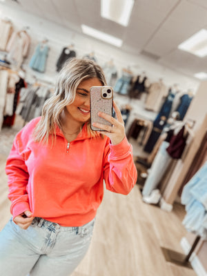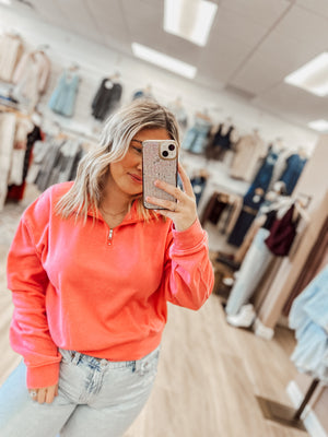 Wrap yourself in plush comfort with this irresistibly soft fleece pullover in a vibrant coral pink hue. This cozy essential brings both warmth and style to your casual wardrobe with its relaxed, lived-in aesthetic.