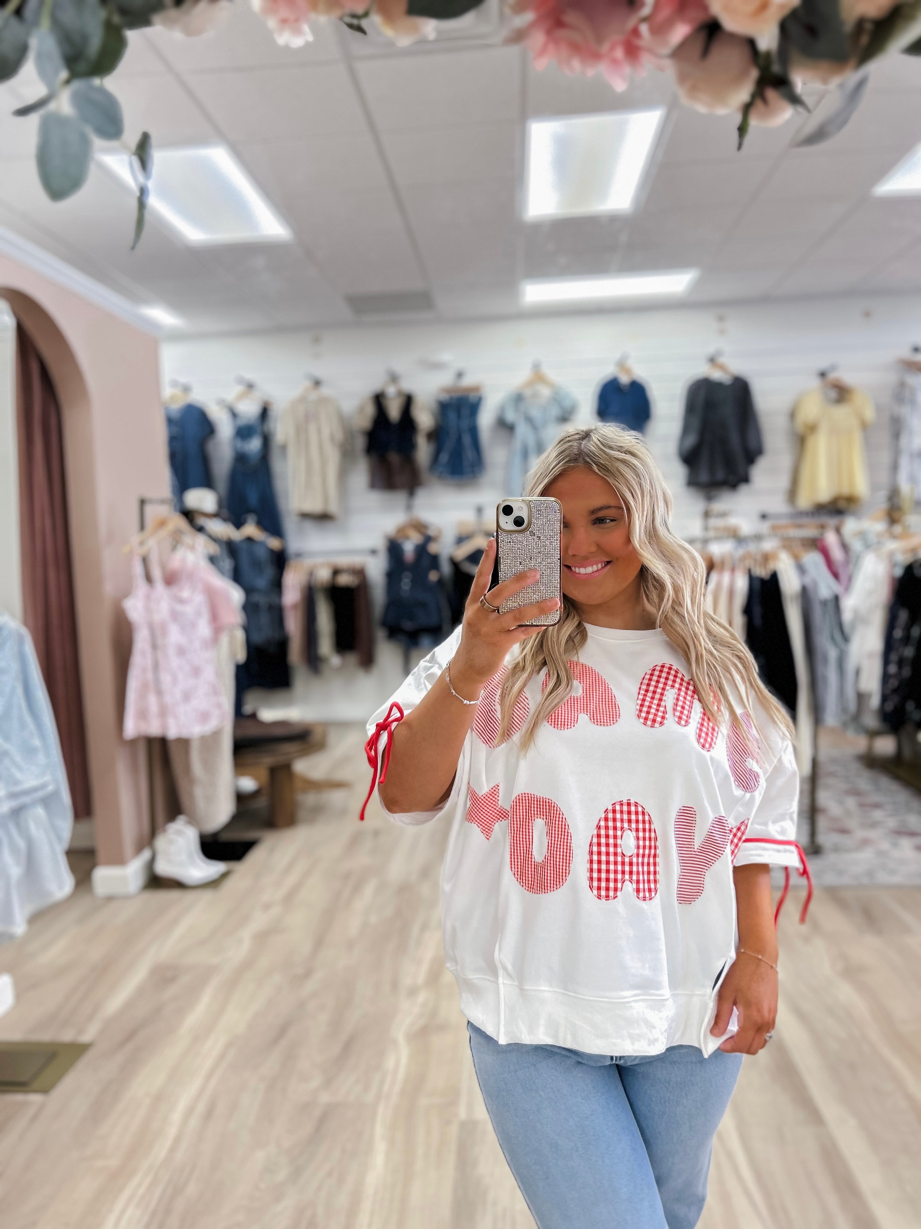 Bold, spirited, and made for the spotlight — the Red Crush Game Day Pullover is your ultimate statement piece for cheering in style. This relaxed-fit white top features oversized “GAME DAY” lettering in playful orange gingham and stripe patterns, finished with coordinating star accents for that extra pop of team pride.
