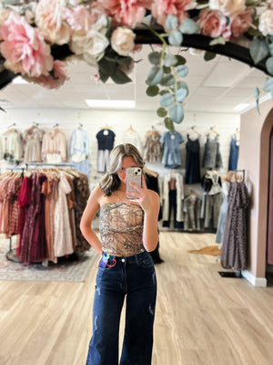 Woodland Camo Print Jersey Longline Bandeau Top Strapless Elevated Basic Top Contemporary Forest Woodland Camo in Green Comfortable Stretch Fabric Back To School Western Rodeo Outfit Fashion Inspo